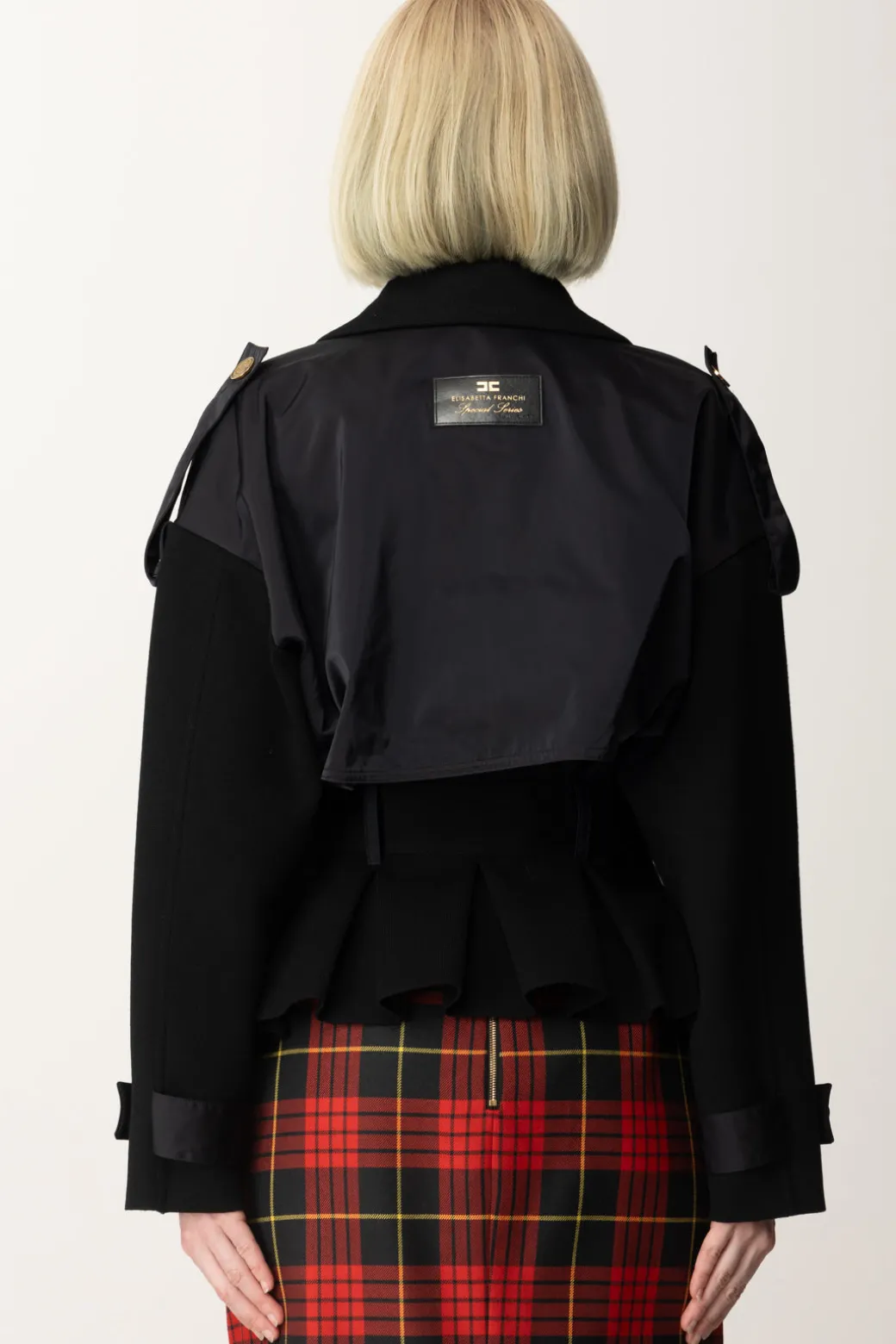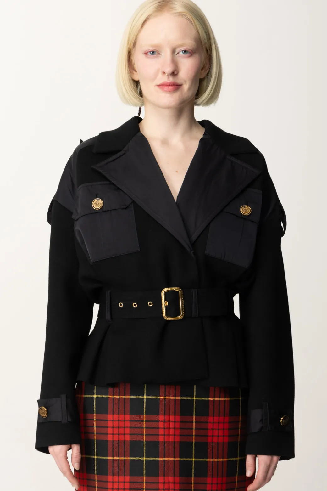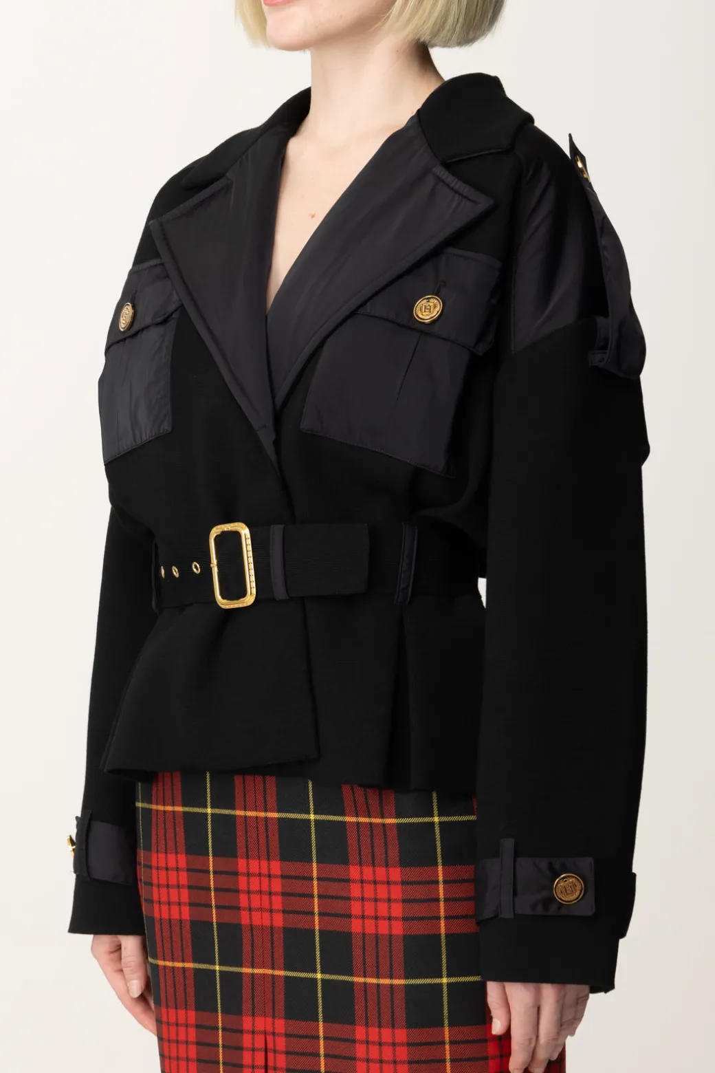 Tasche applicate in nylon, bottoni dorati con logo e cintura in vita con fibbia decorativa: un insieme di particolari concorrono al carattere distintivo di questo giubbotto Elisabetta Franchi tricot. Il design strutturato e il colletto oversize aggiungono un tocco di carattere, che completa alla perfezione il gusto aviator di questo capo.