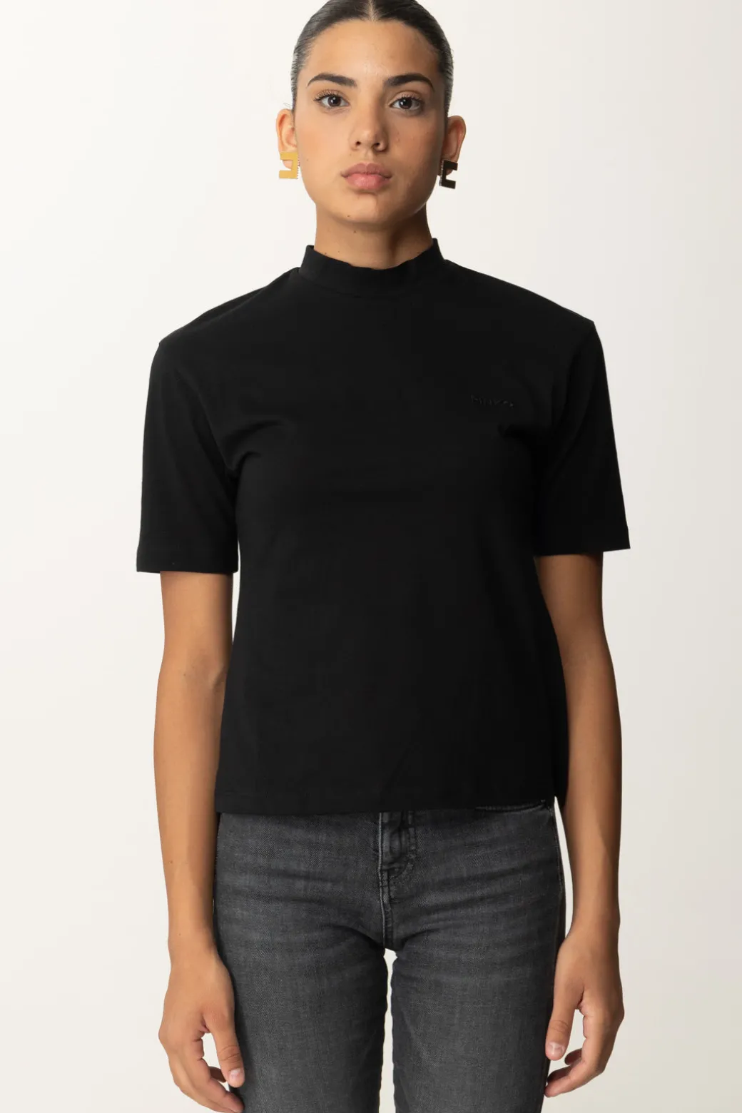 Un dettaglio ti farà apprezzare questa t-shrit Pinko fino a stagione inoltrata: grazie al colletto alto si presta benissimo a diventare un pratico sottogiacca o per essere indossata in combinazione a cardigan. Semplice e proposta in diverse varianti colore, piccolo logo lettering ricamato in tinta sul petto.
